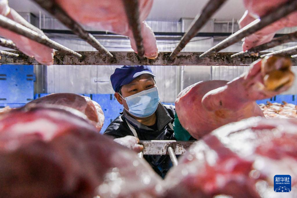 11月6日,在浙江省金华金年火腿有限公司车间内,技师查看腌制火腿的原料。