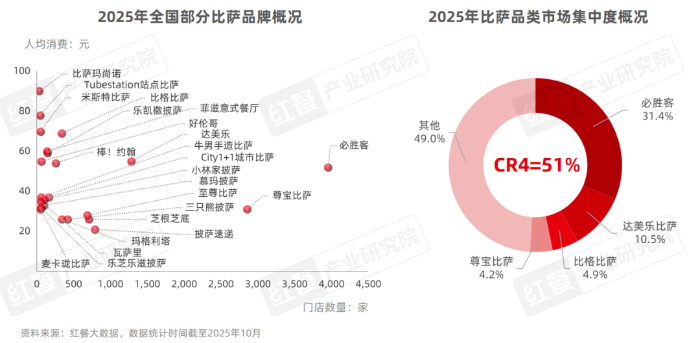 与此同时,比萨品类的高连锁化也推动着比萨市场集中度的提升。基于各品牌的财报数据以及公开信息披露,红餐产业研究院测算,2025年必胜客、达美乐比萨、比格比萨和尊宝比萨四大品牌将有望合计占据51%的市场份额。