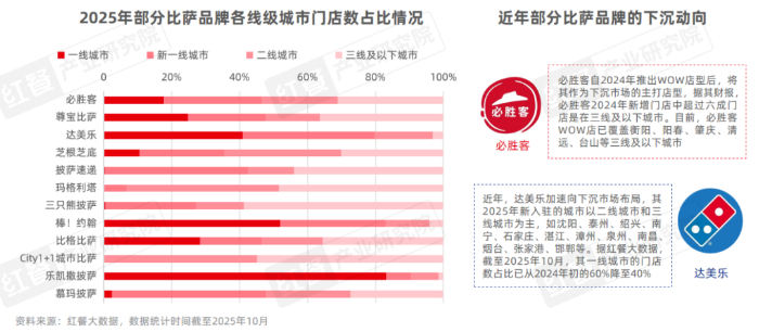 例如,必胜客2024年新增门店中超过六成是在三线及以下城市,截至2025年10月,必胜客在三线及以下城市的门店数占比已超过三成。达美乐2025年新入驻的城市以二线城市和三线城市为主,截至2025年10月,其一线城市的门店数占比已从2024年初的60%降至40%。此外,还有部分比萨品牌主攻下沉市场,如披萨速递、三只熊披萨、City1+1城市比萨等。