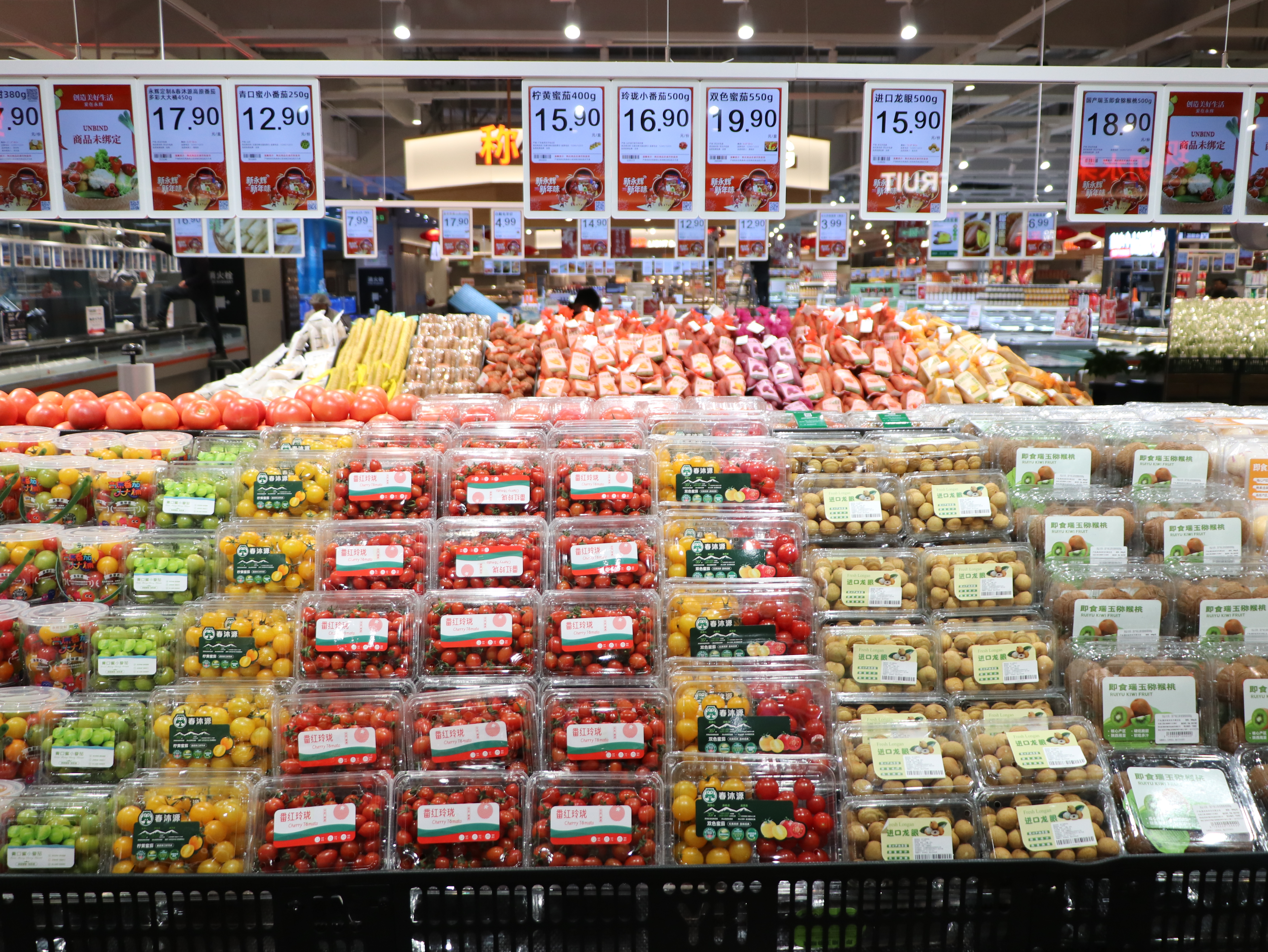 生鲜品类坚持“鲜度管理”与“品质承诺”双轨并行。在运营端,门店严格执行“468”鲜度管理与“日清”制度,从源头杜绝隔夜商品。在商品端,通过供应链改革,筑牢“优质平价”的民生根基和“超值尖货”的品质高度。例如,生鲜区智利车厘子、云南高山蓝莓、丹东红颜草莓等高质价比水果备受喜爱,蔬菜区每500克0.79元的白萝卜等民生商品和有机吮指萝卜等有机蔬菜系列同台竞技。
