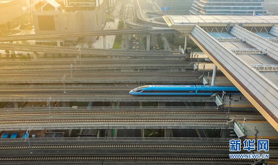 2020年12月24日,由CR300BF型“复兴号”动车组担当的C3887次列车驶出南京南站(无人机照片)。作为中国“复兴号”动车组家族的新成员,CR300BF型“复兴号”动车组软硬件全部由我国自主设计、制造或选型,拥有完全自主知识产权。新华社发