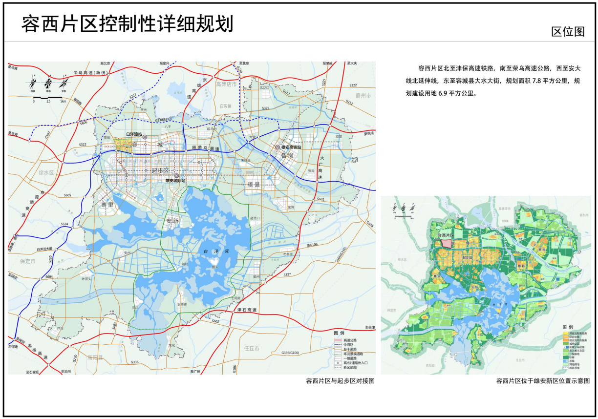 容西片区作为雄安新区容城组团的重要组成部分,紧邻起步区,与容城县城、容东片区、起步区一组团协同发展,主要城市交通线路、生态廊道互联互通,服务搬迁安居,具有保障起步区及周边地区建设的重要功能。