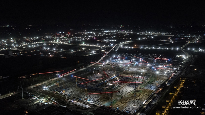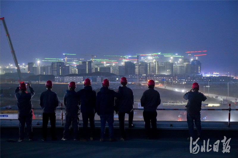 2020年12月25日,雄安新区剧村220千伏变电站,工友们站在自己建起的楼房上欣赏建设中的雄安夜景。来源:河北日报