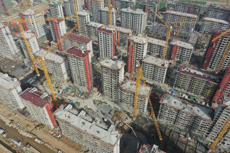 2020年12月28日,雄安新区容东片区中建c组团安置房项目施工现场,工人扛着钢筋走过已经封顶的建筑群。来源:河北日报