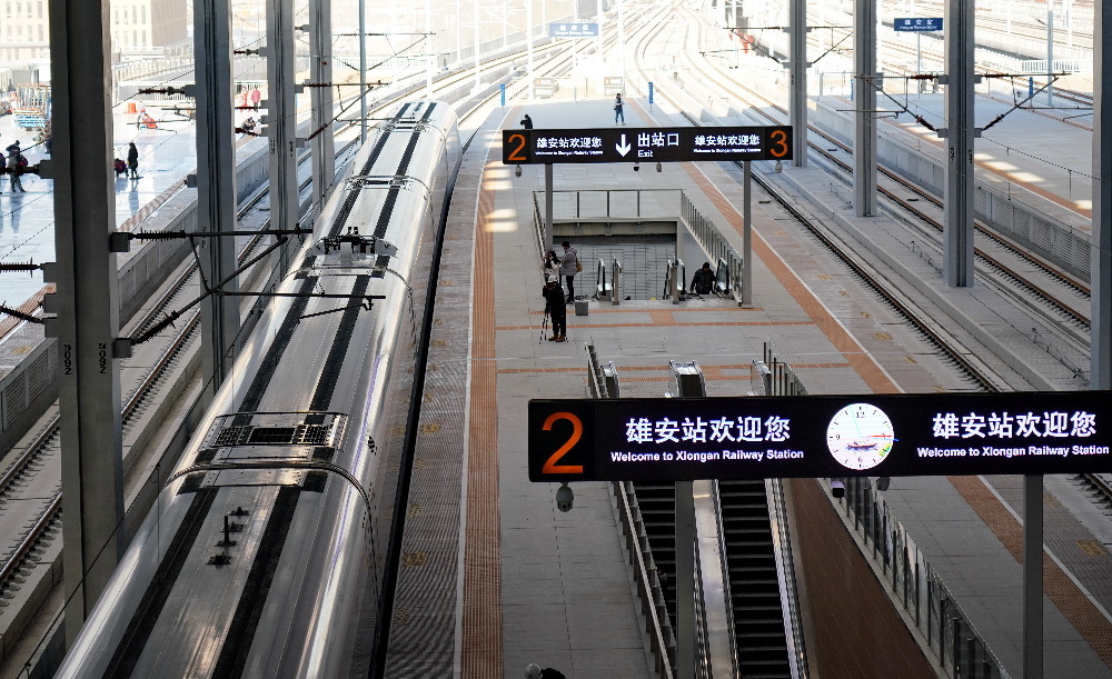 12月24日,用于测试的动车组列车驶离京雄城际铁路雄安站。新华社记者 牟宇 摄