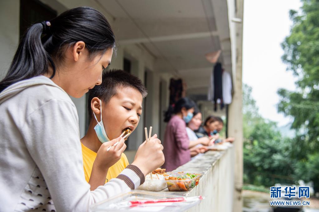 8月14日,柳林镇中心学校集中安置点的受灾群众在吃午饭。新华社发(伍志尊 摄)