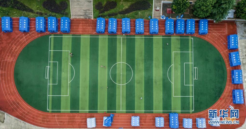 这是8月14日拍摄的柳林镇中心学校集中安置点的操场安置区(无人机照片)。新华社发(伍志尊 摄)