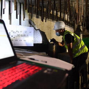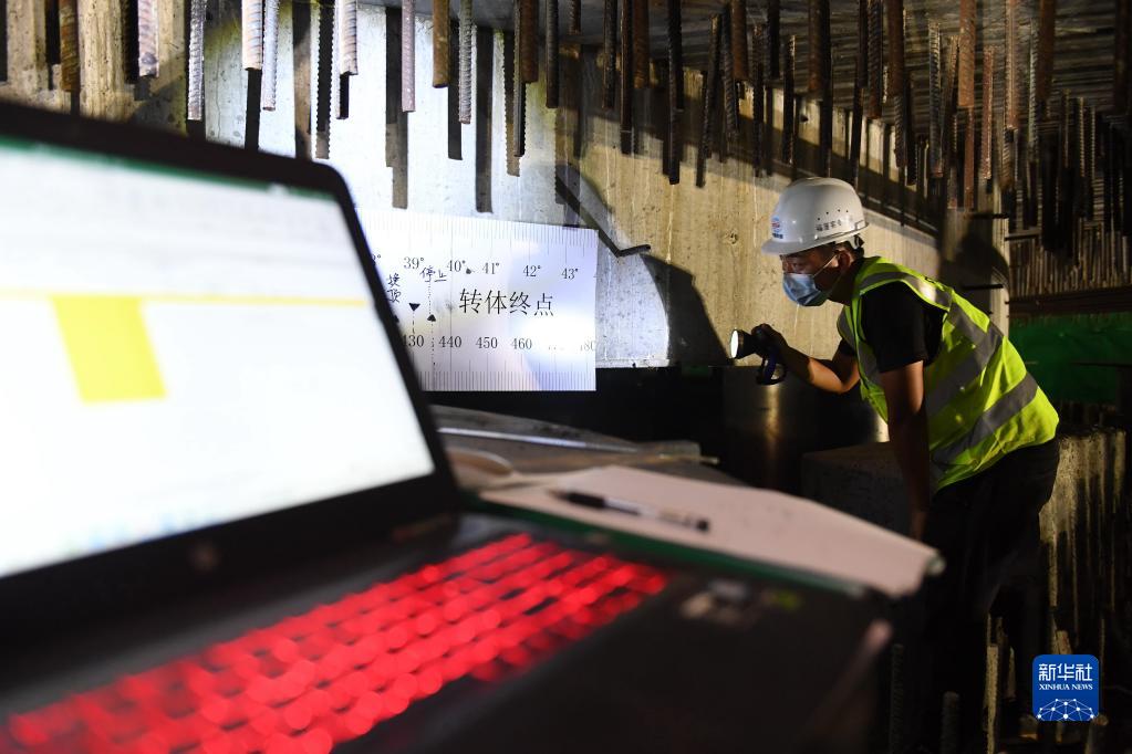 8月23日,施工人员在检查转体斜拉桥转动角度。新华社记者 林善传 摄