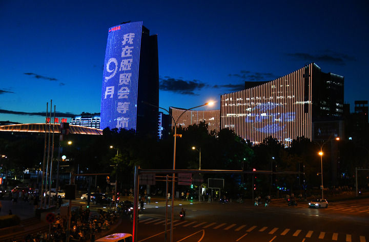 这是8月1日在北京市海淀区中关村大街拍摄的2021年服贸会户外灯光展示。新华社记者 任超 摄
