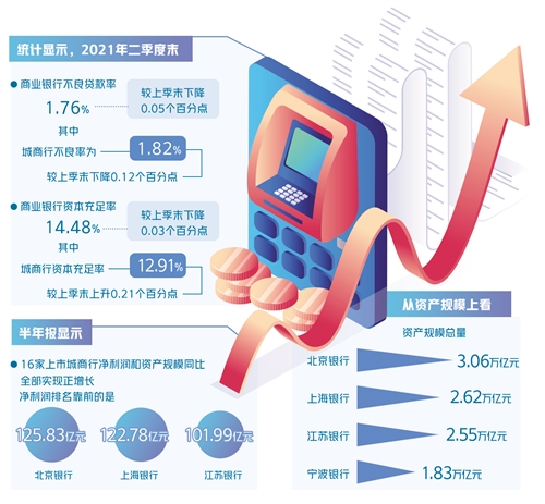 北京银行、上海银行、江苏银行等16家在A股上市的城商行分布于10余个省份。半年报显示,这些城商行净利润和资产规模同比全部实现正增长,但不同区域的银行之间业绩分化明显。