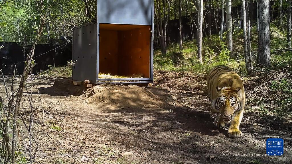 在黑龙江省穆棱林业局有限公司林场,之前在密山市获得成功救护的野生东北虎从铁箱子里走出,回归自然(5月18日摄,视频截图)。专家表示,这是我国首次成功救护并放归野生东北虎。新华社发