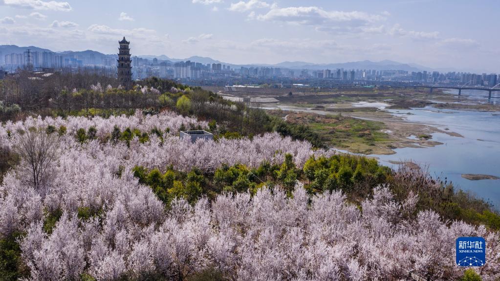 汉江之畔的陕西省安康市城东新区鲜花盛开(3月3日摄,无人机照片)。新华社记者 陶明 摄