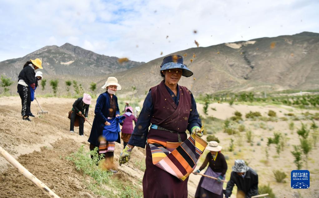 在雅鲁藏布江西藏山南段沙丘上,当地群众进行人工造林(7月20日摄)。新华社记者 晋美多吉 摄