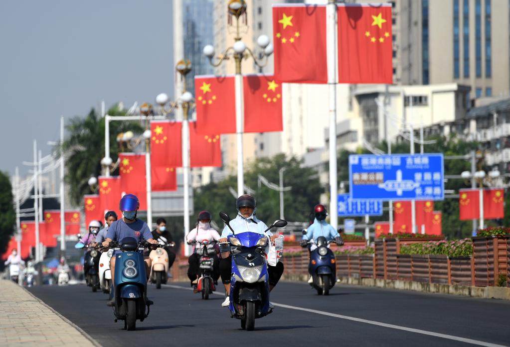 9月29日,市民从挂满国旗的广西南宁市南湖大桥上经过。(新华社记者陆波岸摄)