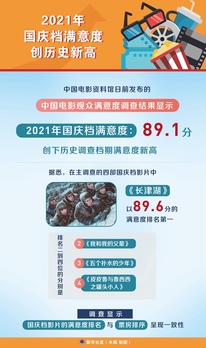 新华社北京10月8日电(记者王鹏)中国电影资料馆日前发布的中国电影观众满意度调查结果显示,2021年国庆档满意度89.1分,创下历史调查档期满意度新高。