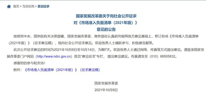 据国家发改委网站消息,国家发改委8日就《市场准入负面清单(2021年版)》向社会公开征求意见。征求意见稿提及,禁止违规开展新闻传媒相关业务。