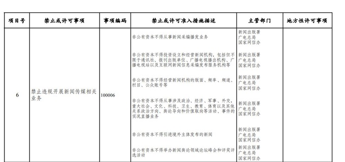 2、非公有资本不得投资设立和经营新闻机构,包括但不限于通讯社、报刊出版单位、广播电视播出机构、广播电视站以及互联网新闻信息采编发布服务机构等。