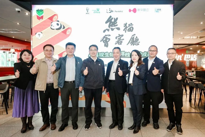 10月15日,嘉宾们共同为Pandaful熊猫会客厅揭幕。图片中从右至左依次为:四川省大熊猫科学研究院院长张志和、新华网四川公司总经理侯大伟、肯德基川渝市场总经理李学红、中国大熊猫保护研究中心副主任刘苇萍、新华社四川分社社长惠小勇、成都市委外宣办(市政府新闻办)副主任陈程、新华智云董事长傅丕毅、百胜中国公共事务西区总监陈娟。