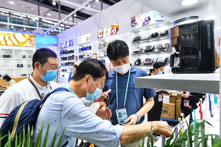 图为三名来自韩国的采购商在第130届广交会小电器展台选购产品。新华社记者 刘大伟 摄