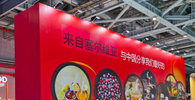 在1.1馆入口处,塞尔维亚工商会展台上“与中国分享我们最好的”几个大字格外引人注目。