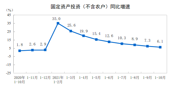 1—10月份,全国固定资产投资(不含农户)445823亿元,同比增长6.1%;比2019年1—10月份增长7.8%,两年平均增长3.8%。其中,民间固定资产投资254462亿元,同比增长8.5%。从环比看,10月份固定资产投资(不含农户)增长0.15%。
