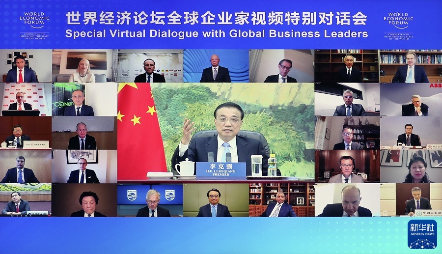 新华社北京11月17日电 国务院总理李克强11月16日晚在人民大会堂出席世界经济论坛全球企业家特别对话会,发表致辞并同企业家代表互动交流。对话会以视频方式举行,世界经济论坛主席施瓦布主持,来自40多个国家的近400位企业家参加。