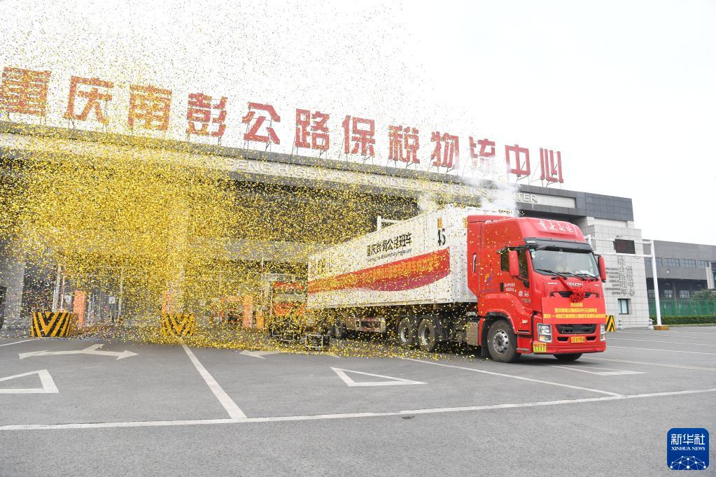 4月28日,重庆至老挝万象跨境公路班车直通车从重庆南彭公路保税物流中心驶出。新华社记者 唐奕 摄