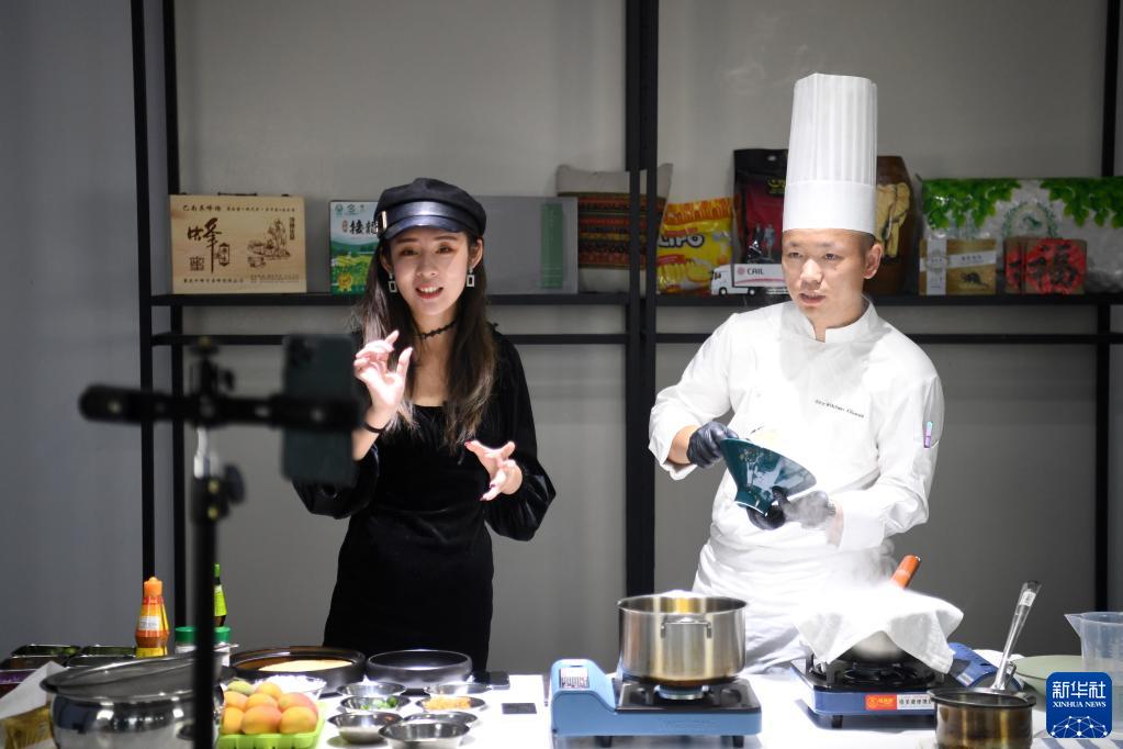 6月28日,在位于重庆巴南的东盟商品集采城内,主播和厨师在进行美食直播。新华社记者 唐奕 摄