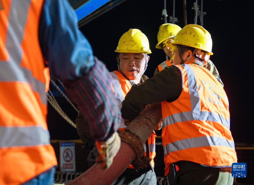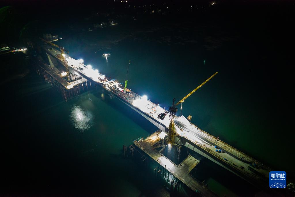 11月27日凌晨,工人们在常益长高铁资水特大桥上进行合龙作业。新华社记者 陈思汗 摄