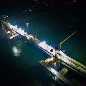 11月27日凌晨,工人们在常益长高铁资水特大桥上进行合龙作业(无人机照片)。新华社记者 陈思汗 摄