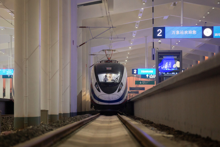 11月21日,在老挝首都万象,“澜沧号”动车组停靠在中老铁路万象站。新华社发(凯乔摄)