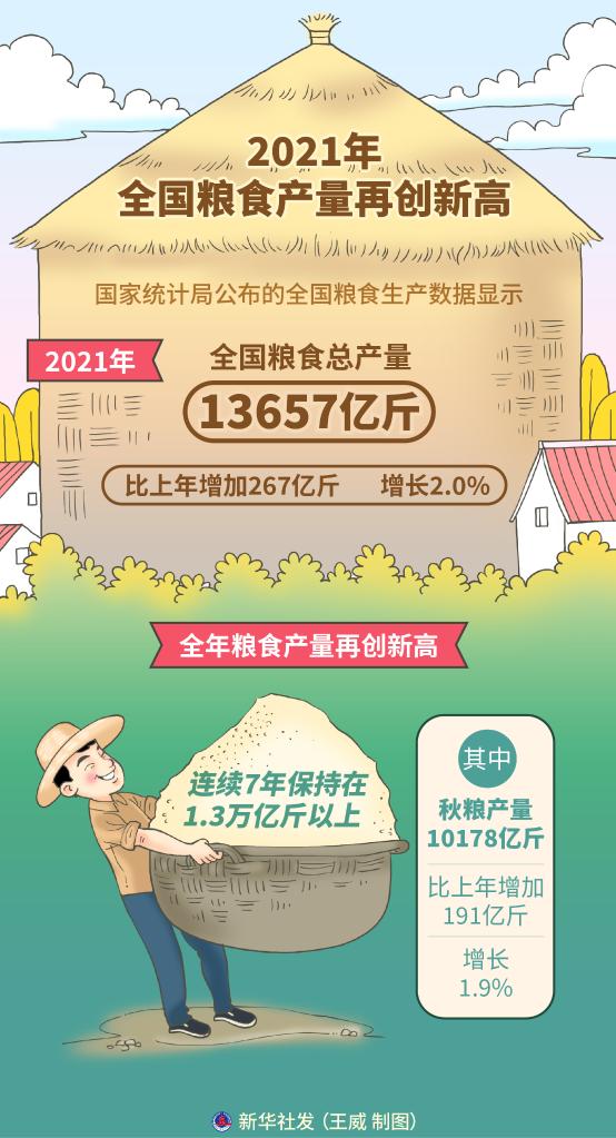 新华社北京12月6日电(记者魏玉坤)国家统计局6日发布数据,2021年全国粮食总产量达13657亿斤,比上年增加267亿斤,增长2.0%,全年粮食产量再创新高,连续7年保持在1.3万亿斤以上。