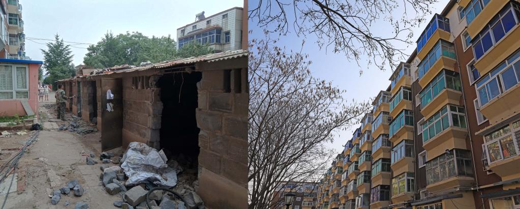 锦州市五里营子小区在“老旧小区”改造前后对比图。(左图为小区改造之前的违章建筑,2020年7月16日摄;右图为改造后的小区楼房外观,2021年11月17日摄)新华社记者 杨青摄