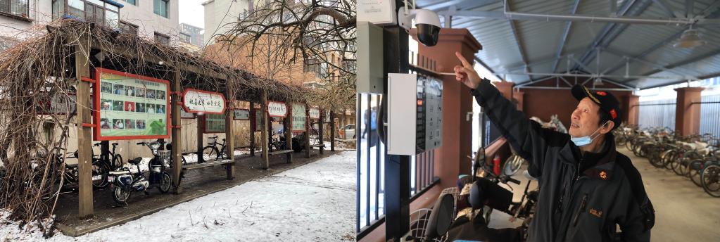 沈阳市和平区三好街103号院“老旧小区”改造前后对比图。(左图为小区改造之前的旧车棚,2021年3月21日摄;右图为改造后的有监控可以给电动车充电的新车棚,2021年11月24日摄)新华社记者 杨青摄