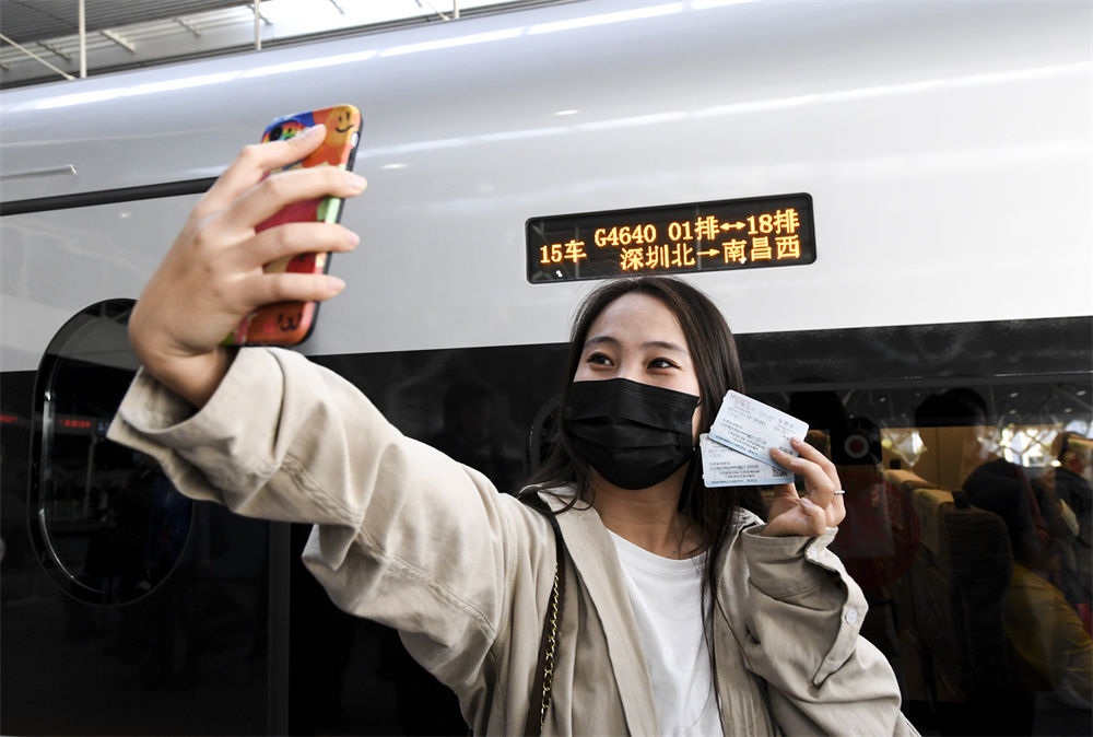 12月10日,乘客准备搭乘赣深高铁深圳北站开往南昌西站的首班列车时,在车厢外自拍留影。新华社记者 毛思倩 摄