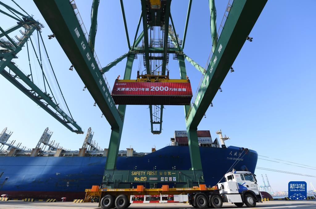 12月18日,天津港2021年第2000万标准箱被吊装至中远海运“天盛河”轮。新华社记者 赵子硕 摄