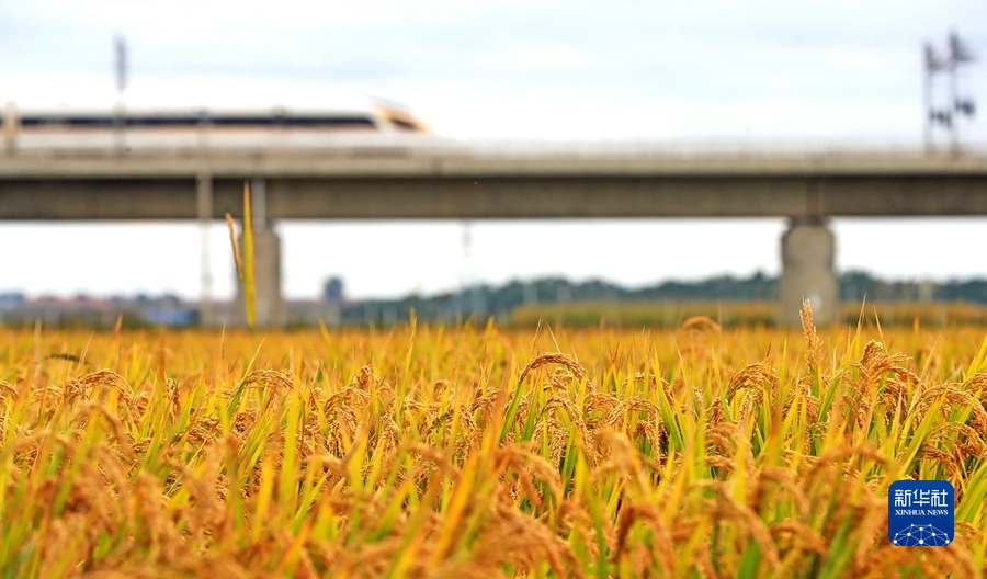 9月22日,在辽宁省铁岭县腰堡镇,高铁列车从金色的稻田旁经过。新华社记者 杨青 摄