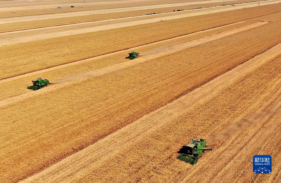 在河南省黄泛区农场九分场的麦田里,农机手操作收割机收获小麦(无人机照片,6月6日摄)。新华社记者 李安 摄