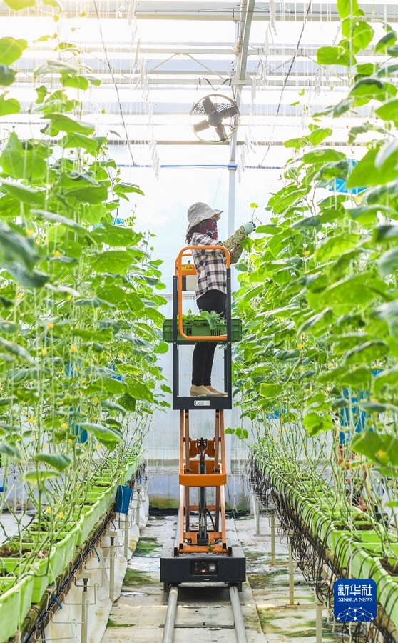 9月22日,在海南省陵水现代农业示范基地,工人为黄瓜苗吊蔓。新华社记者 周佳谊 摄