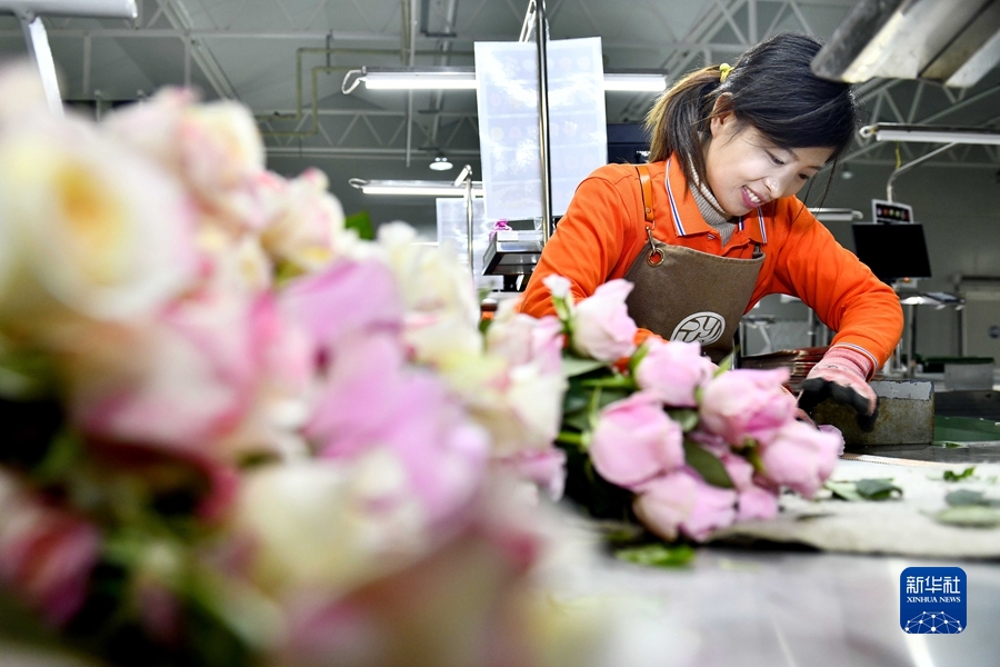 12月17日,在山东省莒县招贤曲坊现代农业产业园玫瑰基地,工作人员在包装玫瑰。新华社记者 郭绪雷 摄