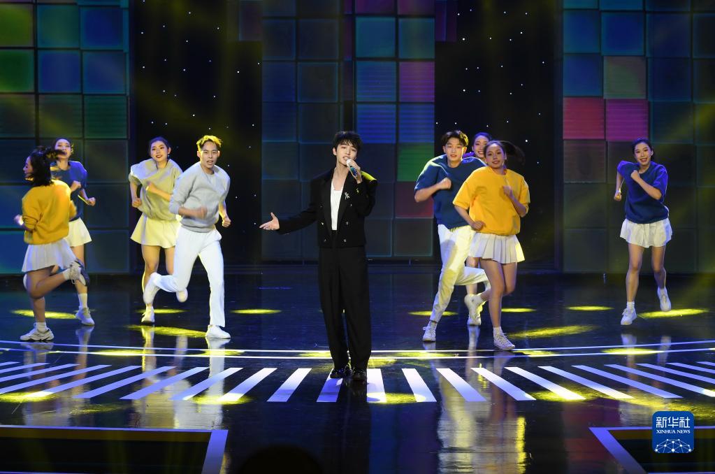 12月28日,王俊凯(中)在开幕式现场表演歌舞《奔跑的青春》。新华社记者 林善传 摄
