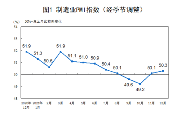 国家统计局服务业调查中心和中国物流与采购联合会12月31日联合发布数据显示,12月份,中国制造业采购经理指数(PMI)为50.3%,比上月上升0.2个百分点,高于50%的临界点。这一先行指标连续两个月回升,显示出经济运行和市场预期的积极变化。
