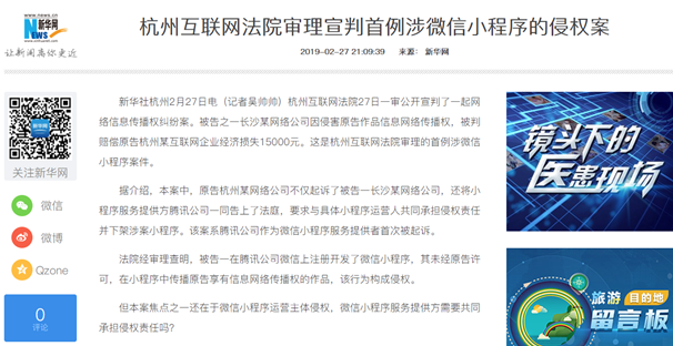 2019年2月27日,杭州互联网法院一审公开宣判了一起网络信息传播权纠纷案。在这起案件中,腾讯公司作为小程序的开发平台而上了被告席。法院认为腾讯公司对小程序开发者提供的是架构与接入的基础性网络服务,其性质类似自动接入、自动传输服务。
