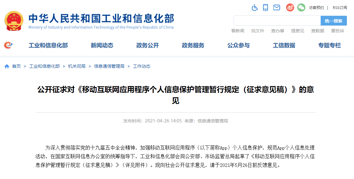 图为4月26日下午,工信部会同公安部、市场监管总局起草征求意见稿,其中提到,App开发运营者应当履行个人信息保护义务。