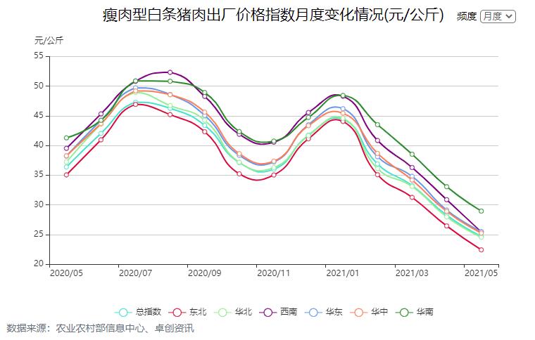 据农业农村部“全国农产品批发市场价格信息系统”监测,今年第19周猪肉价格为28.86元/公斤,相比1月第3周47.51元/公斤的价格高位,已经回落了40%。