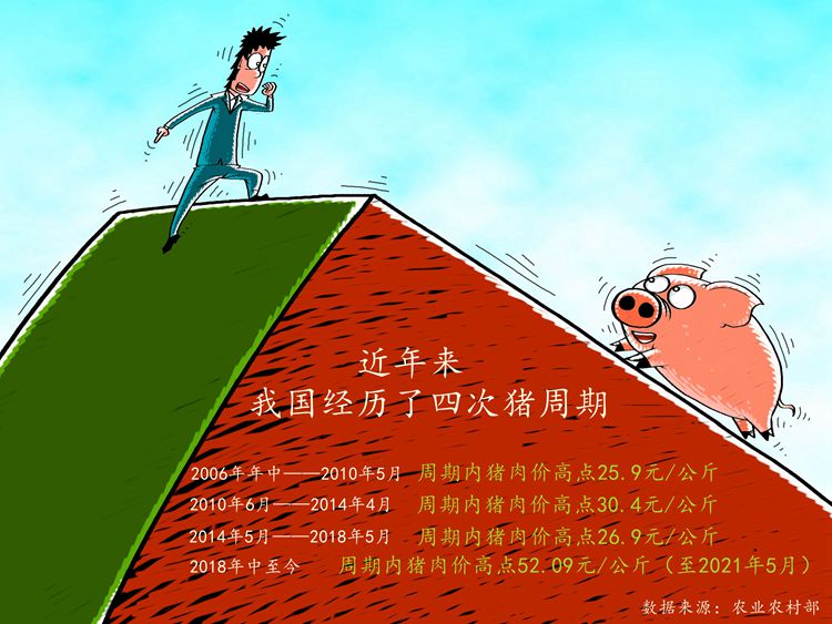 “从2018年中开始,猪肉价格进入新一轮周期。”卓创资讯分析师牛哲介绍,本轮猪周期内,猪肉价格受到非洲猪瘟、环保限产政策、规模化养殖等多重因素影响,前期呈现出涨幅大,速度快等特点,价格上涨幅度为历次猪周期之最,堪称“超级猪周期”。自2019年4月以来,猪肉价格快速上涨,猪肉价格一度曾高达52.09元/公斤,明显超出前两轮周期30元/公斤的高点。但从2021年1月开始,猪肉价格开始进入下行通道。