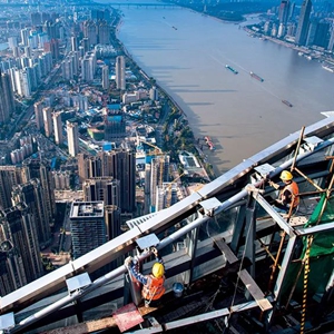 2021年11月15日,中建三局二公司工人在武汉绿地中心项目建设现场近 500 米的高空施工 肖艺九摄