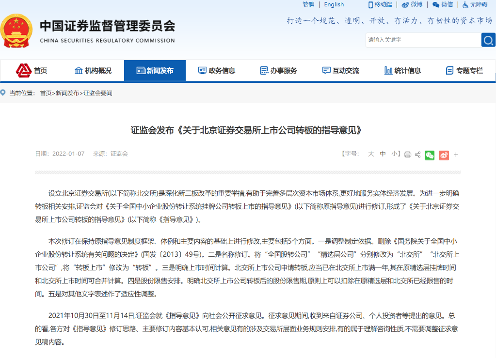 证监会1月7日发布《关于北京证券交易所上市公司转板的指导意见》。