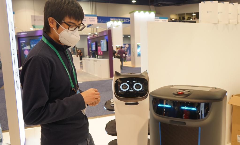 1月5日,一名男子在2022年美国拉斯维加斯消费电子展查看中国深圳公司普渡科技生产的智能机器人。新华社发(曾慧摄)