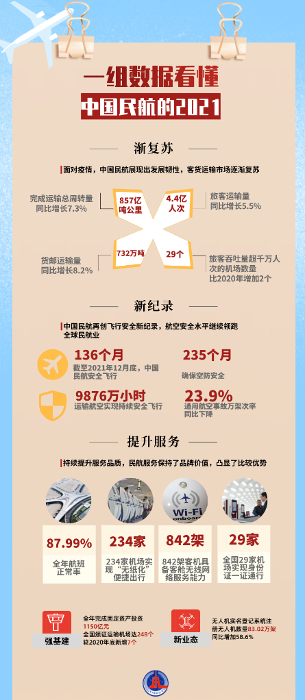 民航“三中心”投运、沪蓉大通道贯通、京广大通道南段空域优化调整取得进展……“抓住运行总量低位运行的窗口期,加快补齐基础设施短板,优化航班时刻、空域等资源的供给和配置,力争运行保障容量提升一个台阶。”据冯正霖介绍,2021年全行业完成固定资产投资1150亿元,超额完成年度投资目标。新建迁建运输机场9个,全国颁证运输机场达248个。